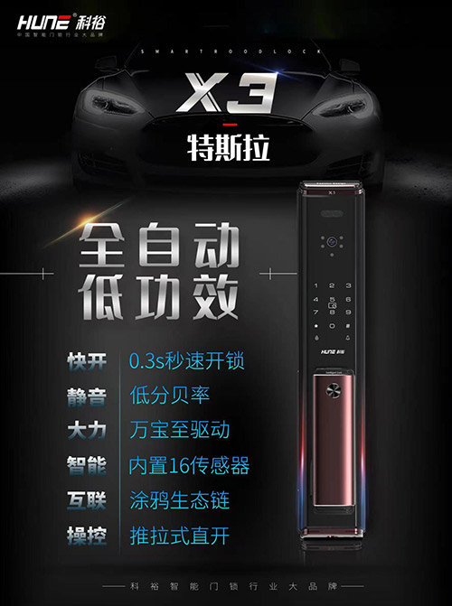 科裕X3智能鎖中的特斯拉,不僅僅是一把能夠保證家庭安全入口的智能鎖,還是門(mén)外的一整套智能家居產(chǎn)品,包括門(mén)鈴、語(yǔ)音對(duì)講、貓眼抓拍、智能聯(lián)網(wǎng)、智能報(bào)警等功能,搭配自主研發(fā)自動(dòng)鎖體,內(nèi)置國(guó)際萬(wàn)寶至離合電機(jī),響應(yīng)速度快,45°快速靜音開(kāi)門(mén),開(kāi)門(mén)時(shí)間約為0.3S,一刷即開(kāi) 。