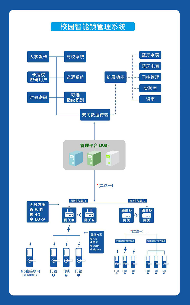 系統(tǒng)由有線/無線校園智能門鎖、智能網(wǎng)關、物聯(lián)網(wǎng)管理平臺組成,通過與學校數(shù)據(jù)中心、宿舍系統(tǒng)、迎新系統(tǒng)、畢業(yè)離校系統(tǒng)、琴房管理系統(tǒng)、一卡通系統(tǒng)等無縫對接,對每把門鎖進行實時狀態(tài)監(jiān)控,實現(xiàn)開門授權、安全防控、數(shù)據(jù)統(tǒng)計、巡更及假期管理等功能,較大地減少宿管人員及管理教師的工作量,使宿管工作由“汗水管理”向“智慧管理”轉變,提高學校數(shù)據(jù)可視化、透明化、統(tǒng)一化管理程度,配合打造學生行為大數(shù)據(jù)分析閉環(huán)。