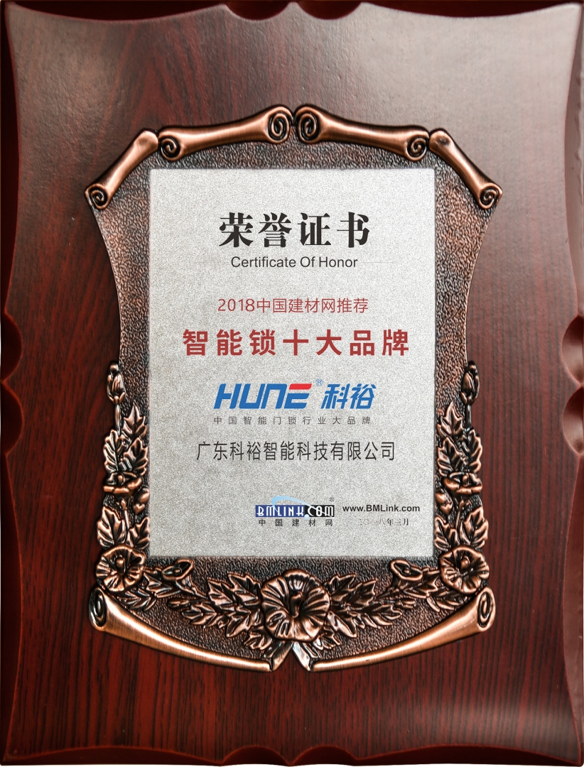 廣東省專精特新中小企業(yè)(2021);智能鎖影響力品牌(2020,中楹榜);廣東省多功能智能鎖具工程技術(shù)研究中心(2019);智能鎖十大品牌(2018,中國建材網(wǎng));連續(xù)10年獲評 “廣東省守合同重信用企業(yè)”等。
