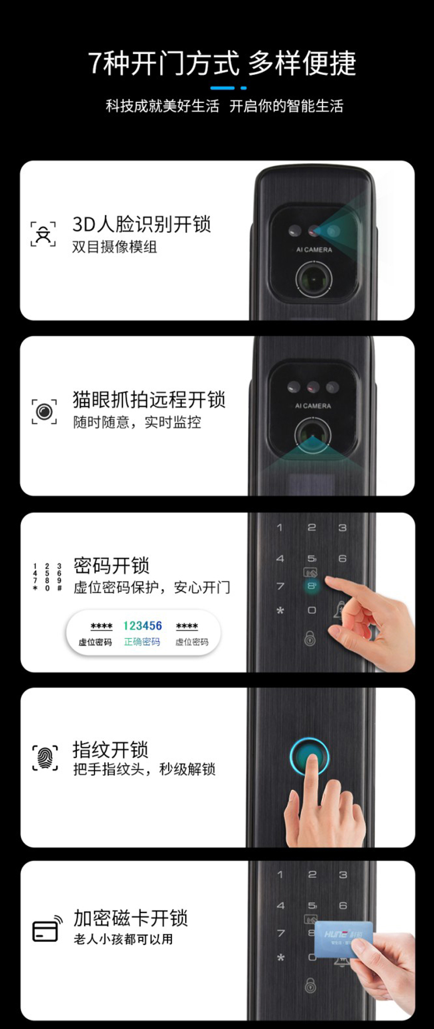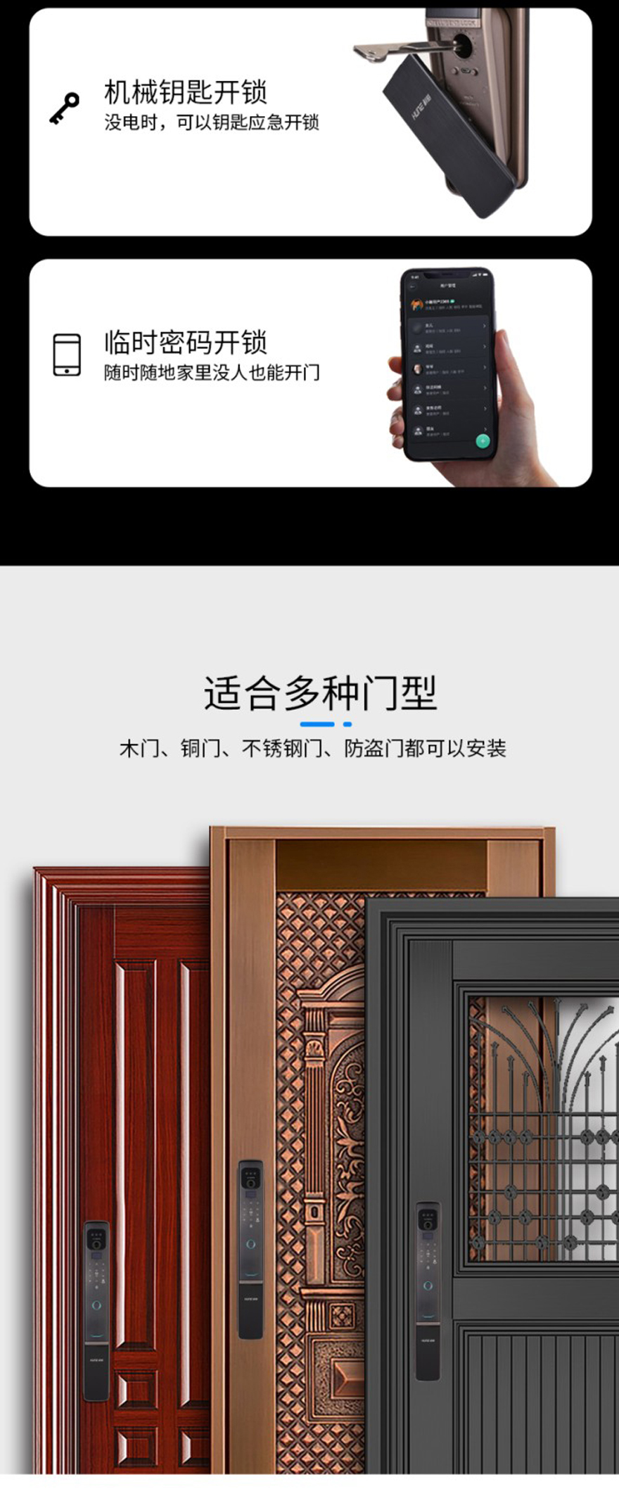 開門方式:人臉識別,指紋,密碼,感應卡,機械鑰匙,微信小程序,手機APP