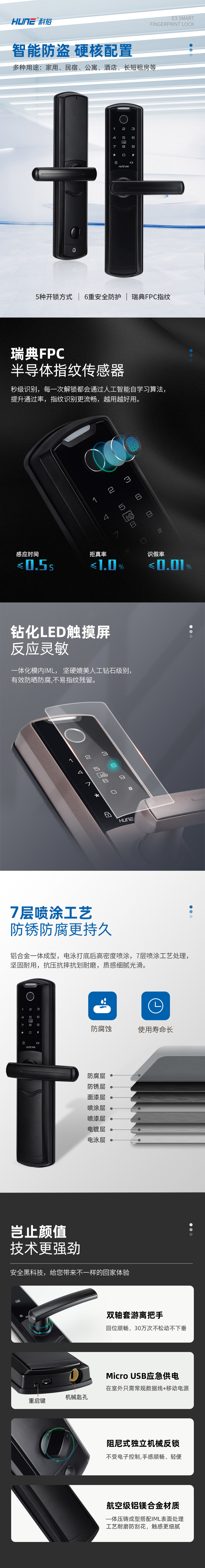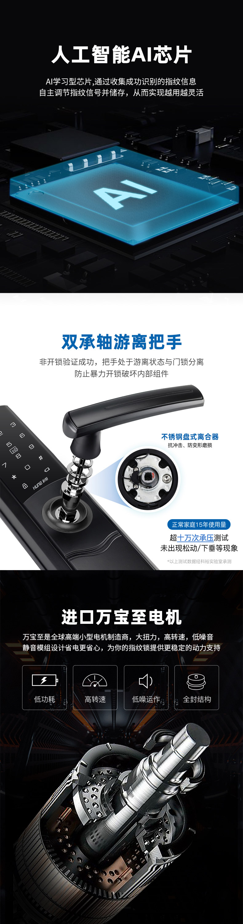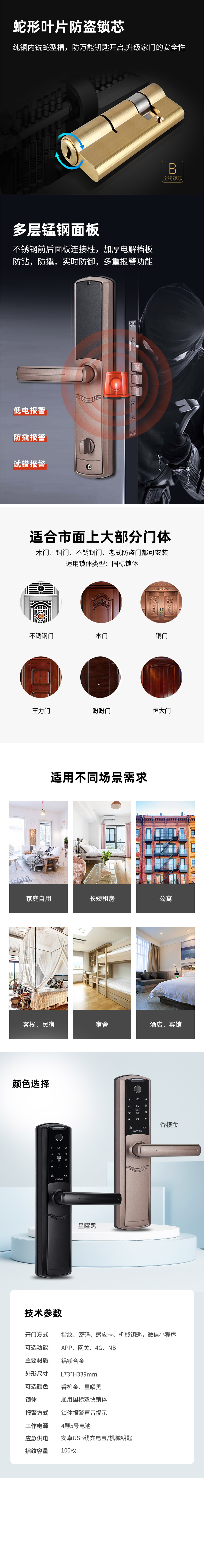 1、外觀簡約時尚,鉆化ledI屏設計反應靈紋,7層噴涂工藝處理質感細膩,雙軸套把手設計,使用舒適,多種開鎖方式,可手機遠程操控,